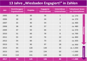 Die Unternehmen unter dem Motto „Wiesbaden Engagiert!“ als Partner zu gewinnen, gelang – die wachsenden Teilnehmerzahlen sprechen für sich. Denn auch die Akteure der Wirtschaft haben ein Interesse daran, das Gemeinwesen , in dem sie erfolgreich wirtschaften, weiterzuentwickeln. Und mit ihrem bürgerschaftlichen Engagement am Standort können Unternehmen das Gute mit dem Nützlichen verbinden und auch positive Wirkungen im eigenen Unternehmen erzielen.