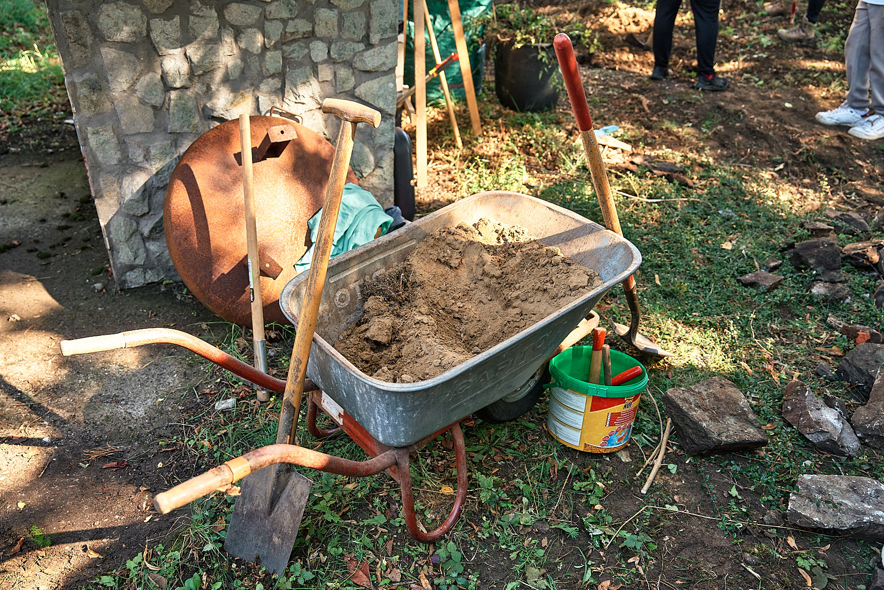Der Bereich hinter dem Backhäuschen hat eine kleine Verwandlung erfahren. Zwei große Hochbeete wurden in vorbereiteten Mulden angelegt, mit Drainageschichten, Kompost und ersten Kräutern befüllt. Das alte Betonfundament wurde freigelegt und dient nun als gemütliche Sitzmöglichkeit – ein Ort zum Plaudern, Ausruhen oder einfach zum Genießen der Natur. Zwischen den Beeten und Sitzplätzen entstanden kleine Wege aus Mulch, die den Garten zugänglich machen und gleichzeitig zum Erkunden einladen.