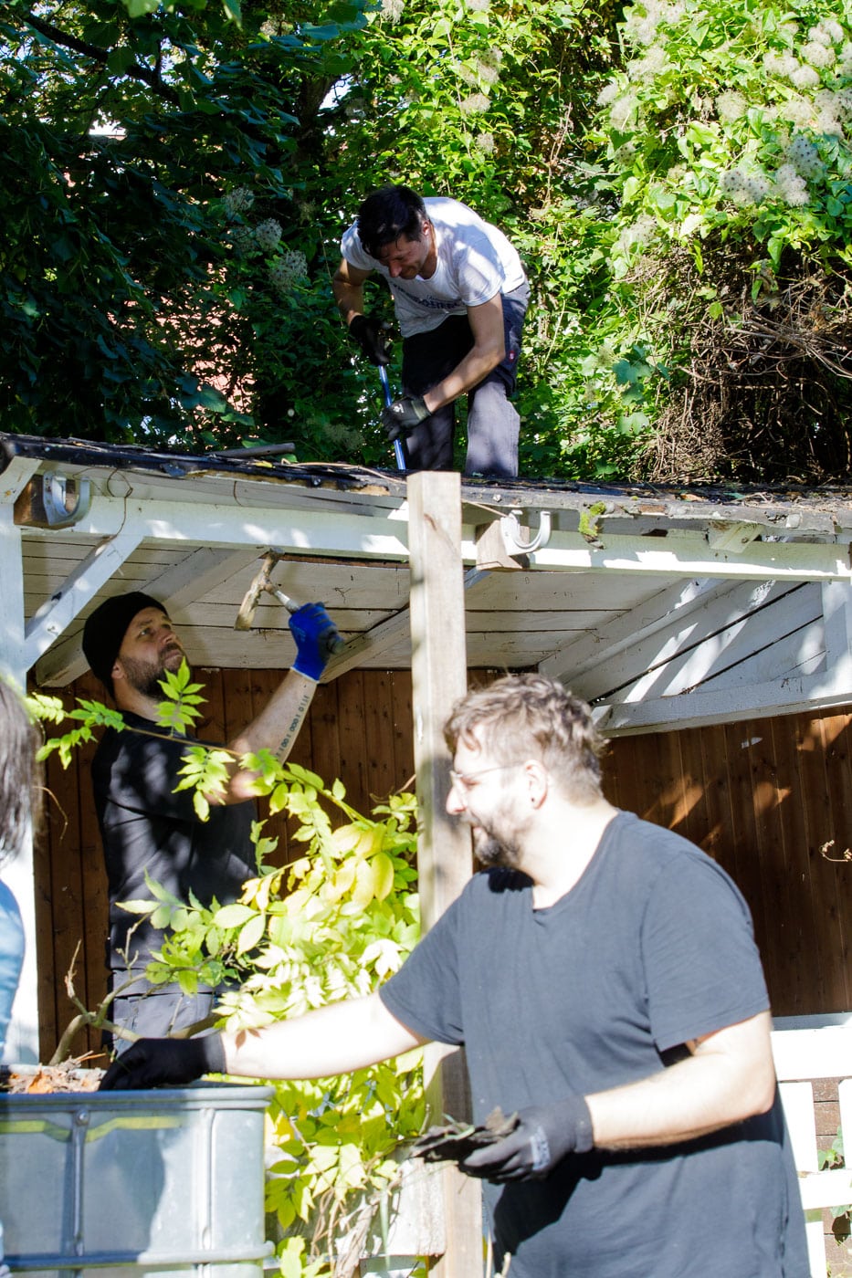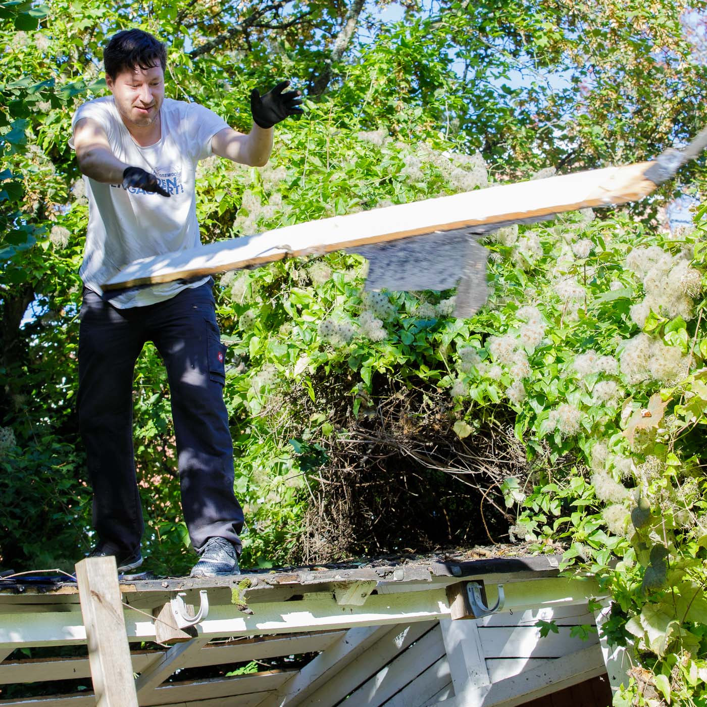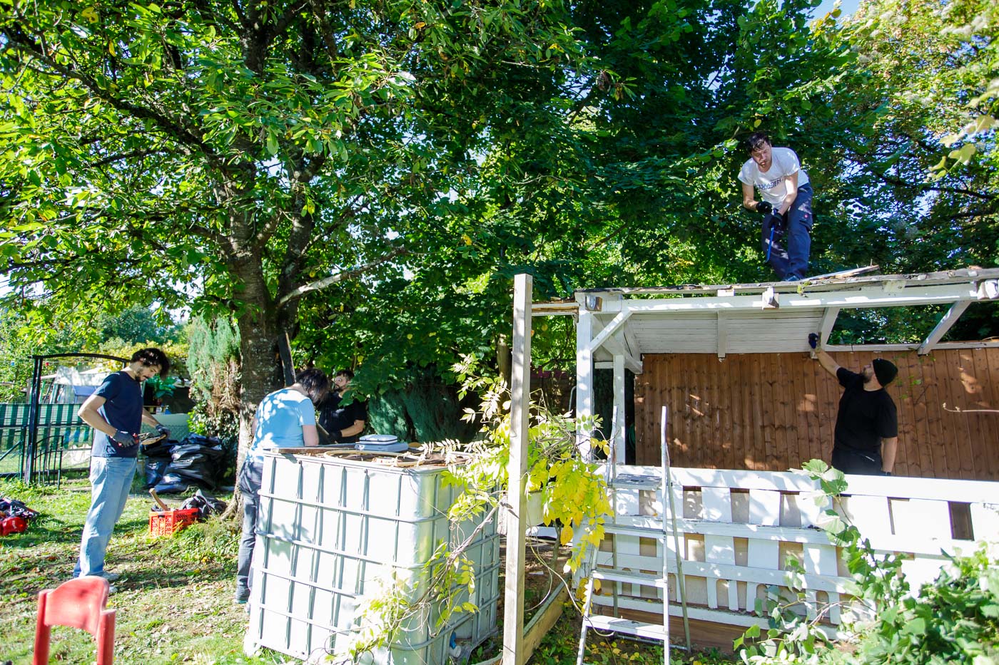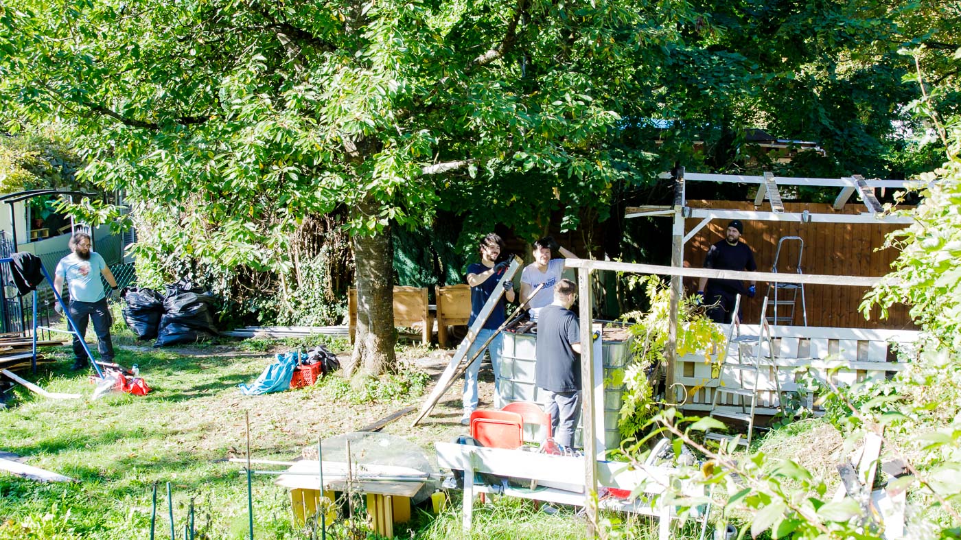 In und an der Grundschule Schelmengraben arbeiteten die engagierten Partner direkt an mehreren Baustellen parallel. Zum einen musste im neuen Garten der Schule eine Gartenhütte abgerissen werden. Sie war nicht mehr nutzbar. Die Firma AOE, die die Schule bereits in früheren Projekten unterstützt hatte, kam mit Hammer und Brecheisen, um Platz für eine neue Hütte zu schaffen. Und setzte das Werkzeug voller Engagement ein. Nun kann der Schulgarten weiter aufgebaut werden.