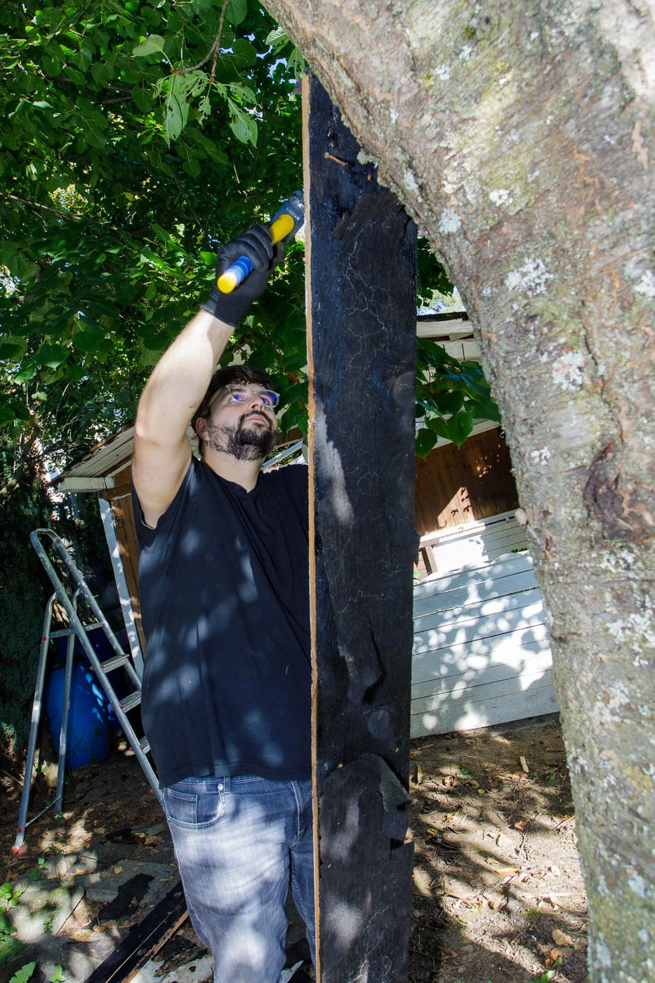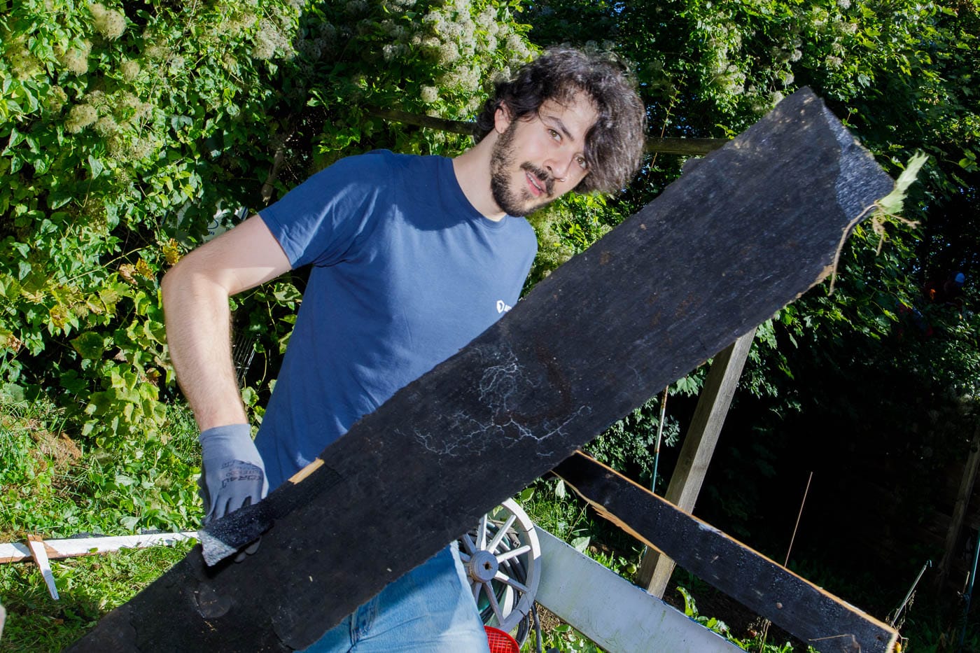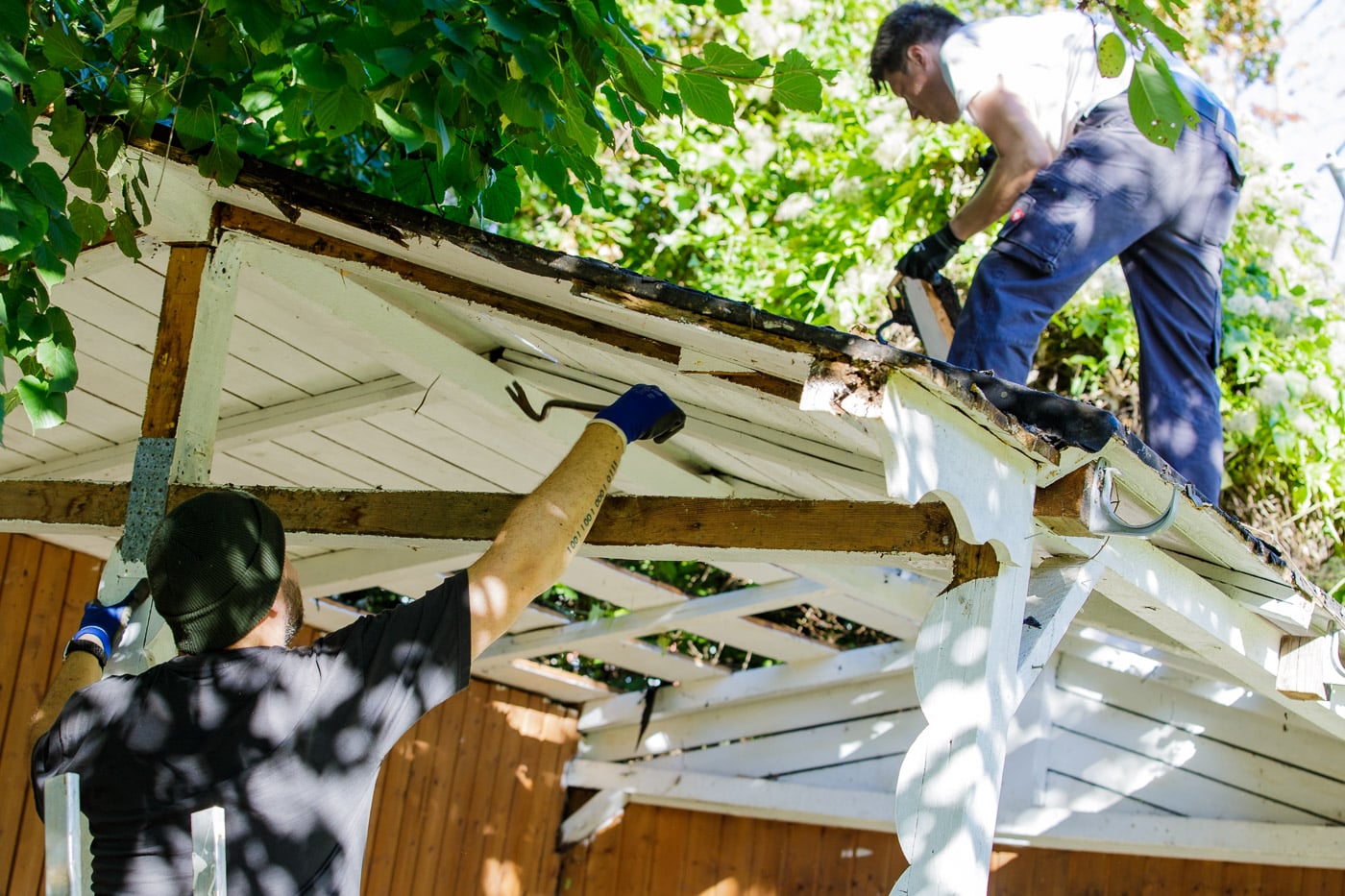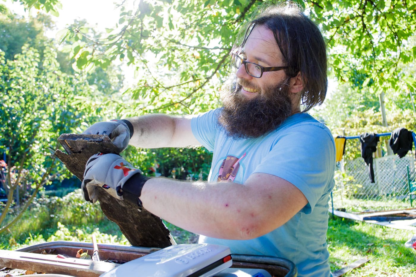 In und an der Grundschule Schelmengraben arbeiteten die engagierten Partner direkt an mehreren Baustellen parallel. Zum einen musste im neuen Garten der Schule eine Gartenhütte abgerissen werden. Sie war nicht mehr nutzbar. Die Firma AOE, die die Schule bereits in früheren Projekten unterstützt hatte, kam mit Hammer und Brecheisen, um Platz für eine neue Hütte zu schaffen. Und setzte das Werkzeug voller Engagement ein. Nun kann der Schulgarten weiter aufgebaut werden.