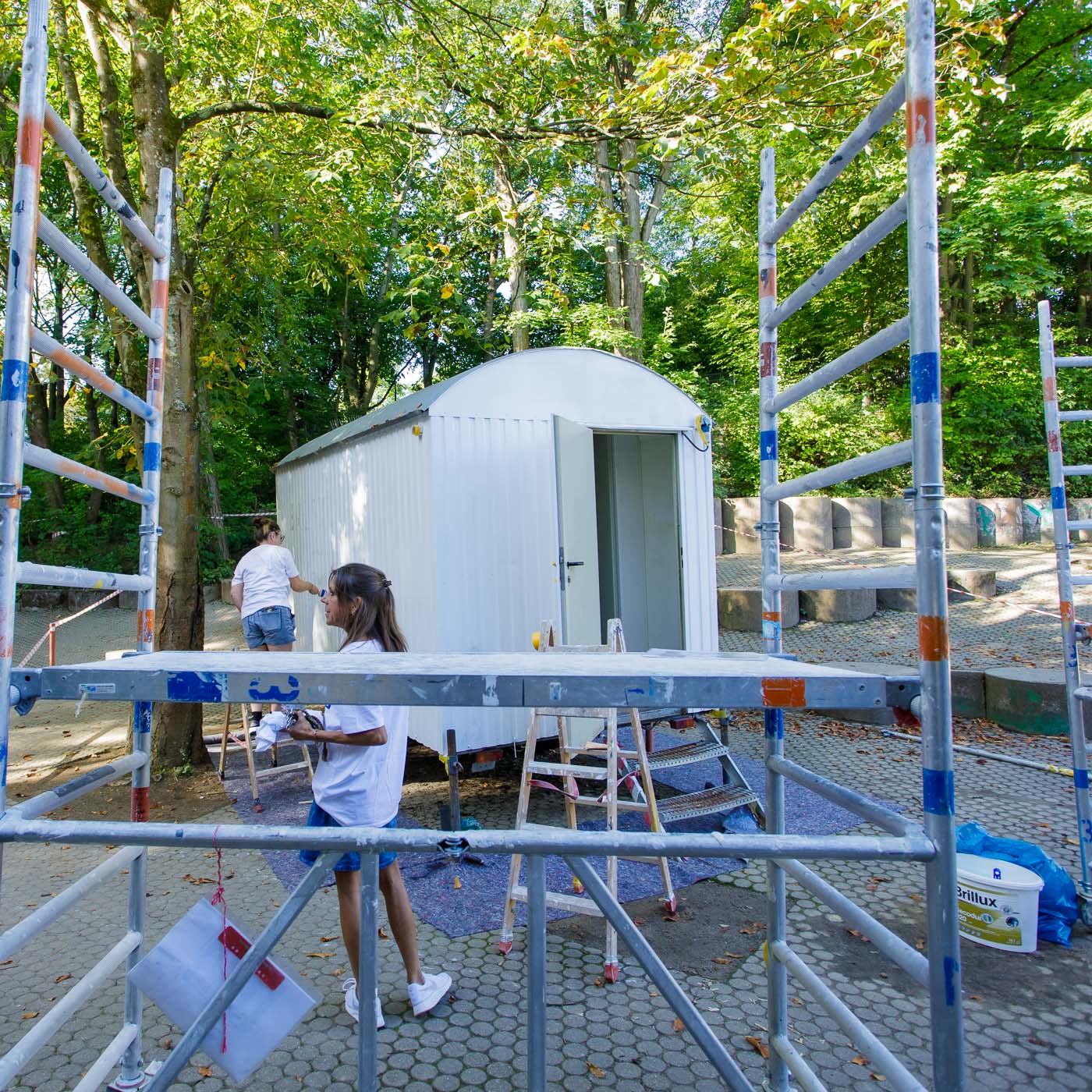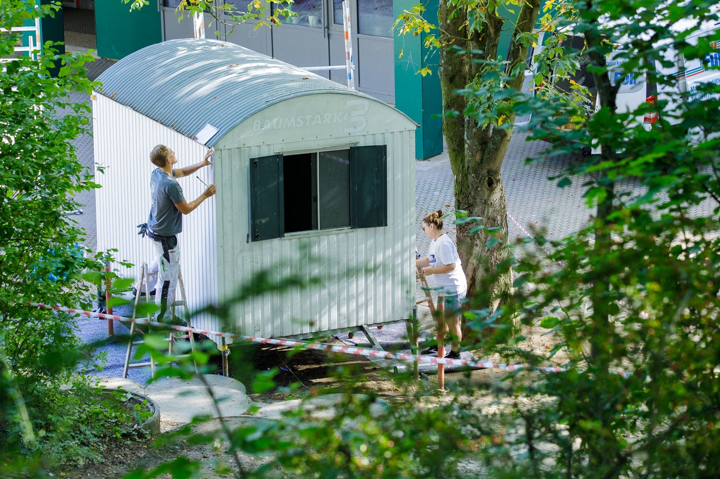 Eine weitere Aktion galt einem Bauwagen, der zu einer Friedenshütte umgestaltet wurde. Max, der Auszubildende der Malerfirma Füll, startete den Projekttag zusammen mit den Kindern. Jetzt kommt er regelmäßig um dieses Projekt zu beenden. Der Bauwagen wurde zuletzt kindersicher gemacht, alle Mängel beseitigt, das Außenbild weitergemalt und Filz an die Innenwände gebracht. Nun steht noch an, die Inneneinrichtung fertigzustellen. Die Kinder haben jetzt einen wunderbarem Ort auf dem Schulhof, wo sie selbst Frieden und Streitschlichtung aktiv gestalten können.