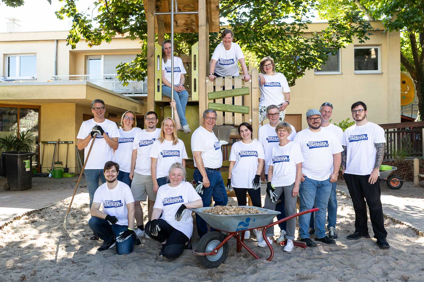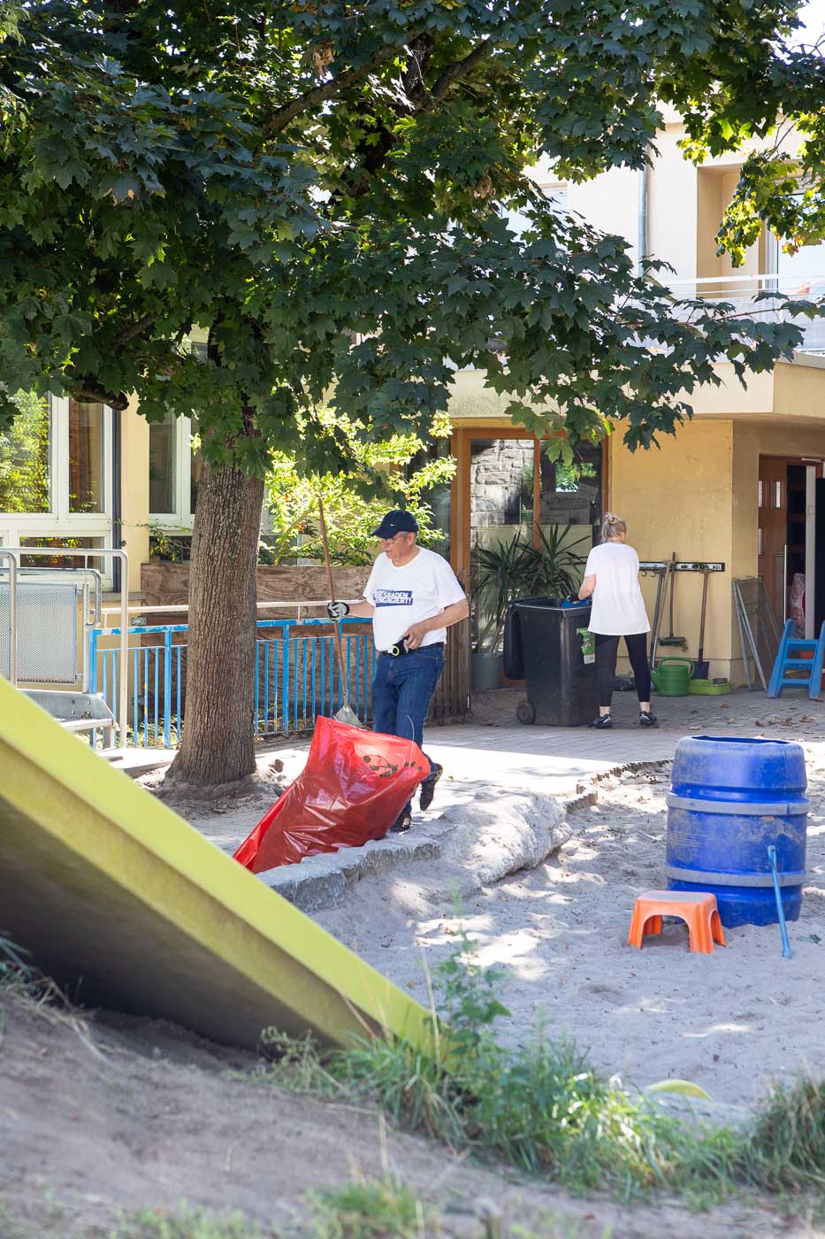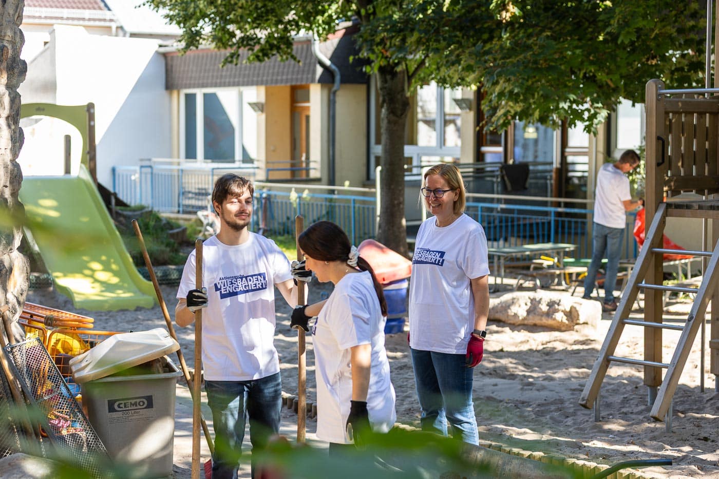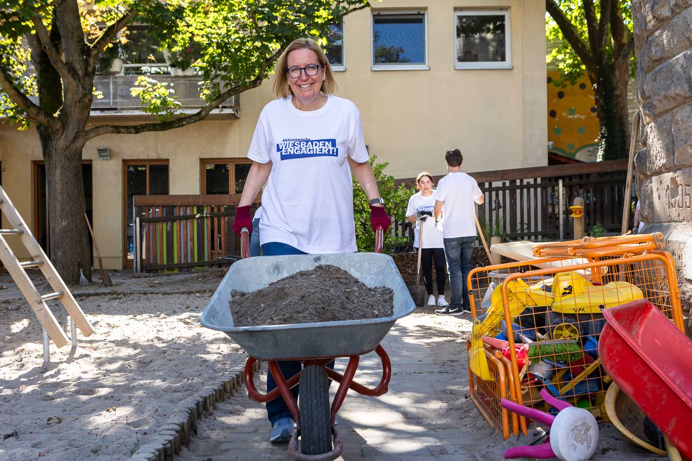 Das Team des Oberbürgermeister-Büros inklusive Oberbürgermeister half mit zahlreichen Schubkarrengängen. Auch die Grünanlagen wurden gepflegt, die Böschung vom Unkraut befreit und neue Bodendecker gepflanzt. Jetzt können die Kinder das Außengelände wieder zum Entspannen und Wohlfühlen nutzen.
