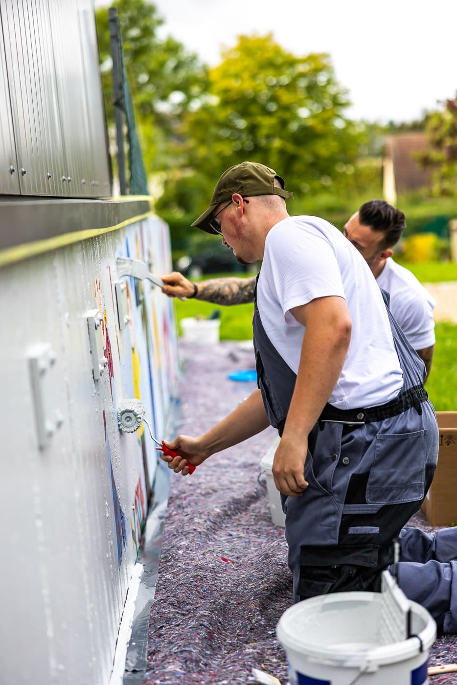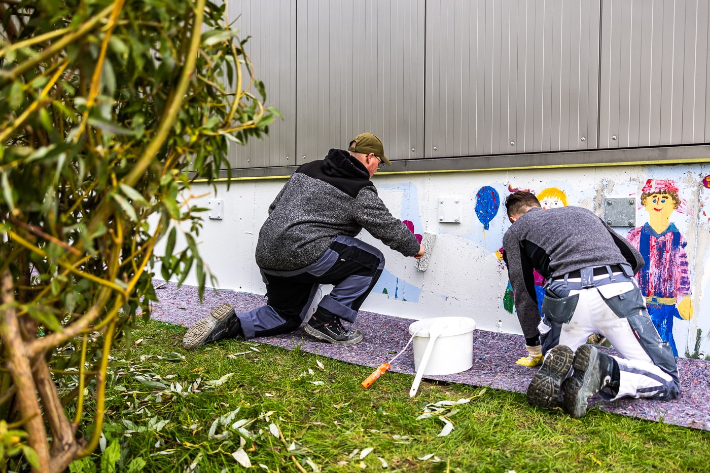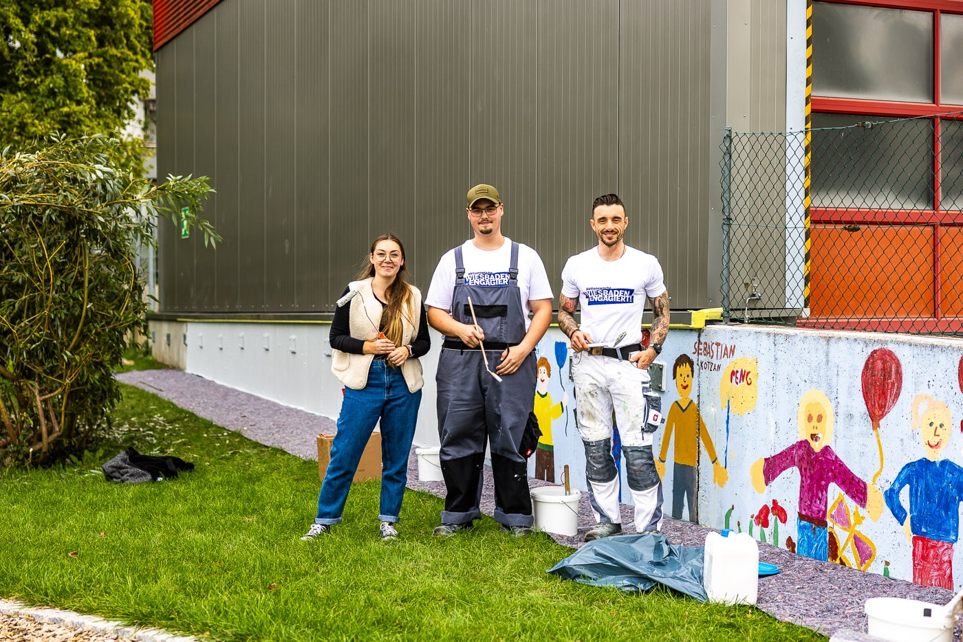 Mehrere Unternehmensteams waren in der Bierstädter Kita gleich an mehreren »Baustellen« und an mehreren Tagen aktiv. Während die engagierten Partner ein Weidentipi flochten, es erweiterten und in Form brachten, arbeitete ein anderes Team am Gartenhaus. Dort wurde das Dach von Moos und Ablagerungen befreit und das Haus gestrichen. Auch das alte Mauerwerk an der Außenseite der Kita erhielt einen Voranstrich, um danach wieder bunt bemalt werden zu können. Rundum erneuert!