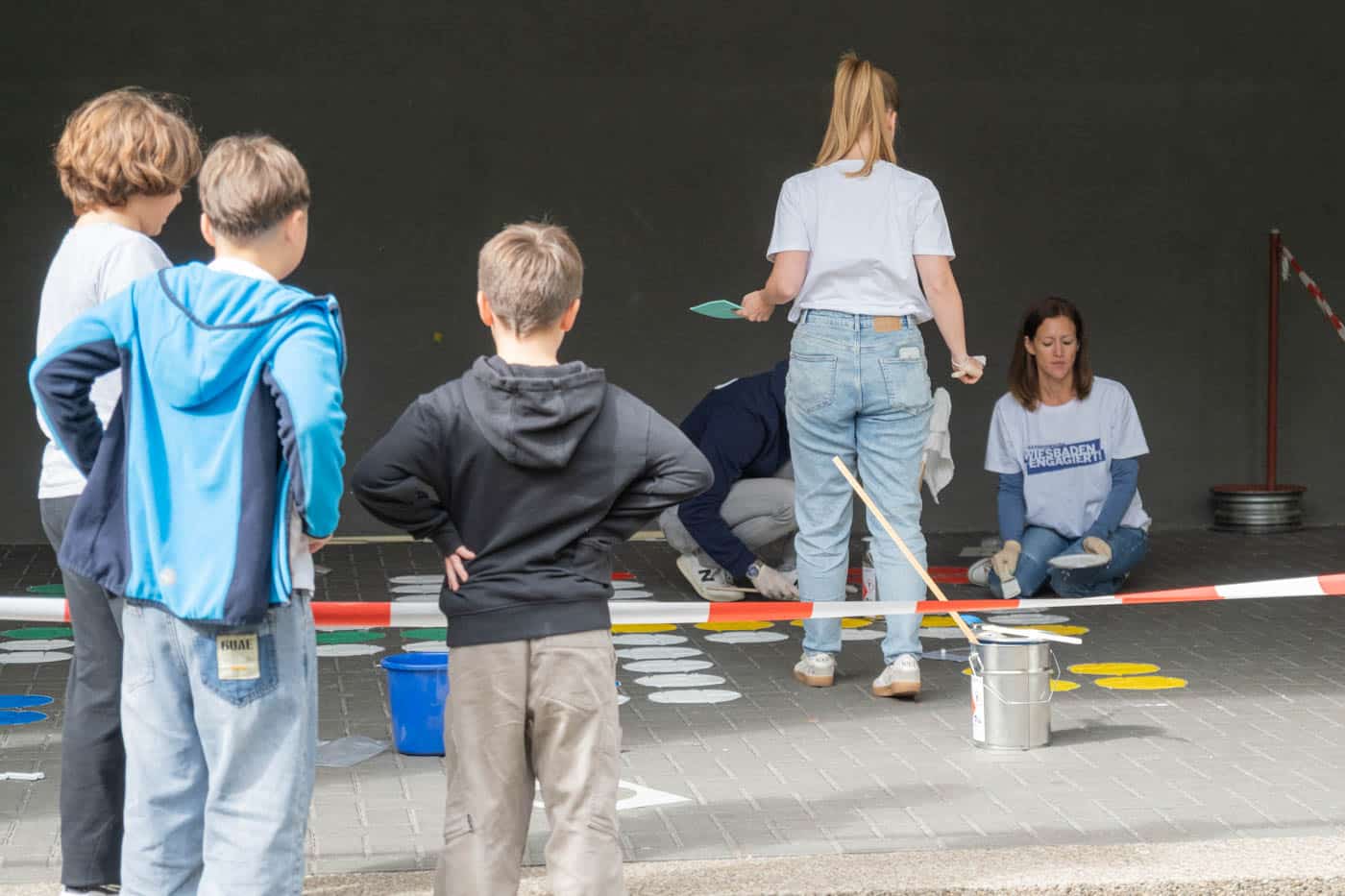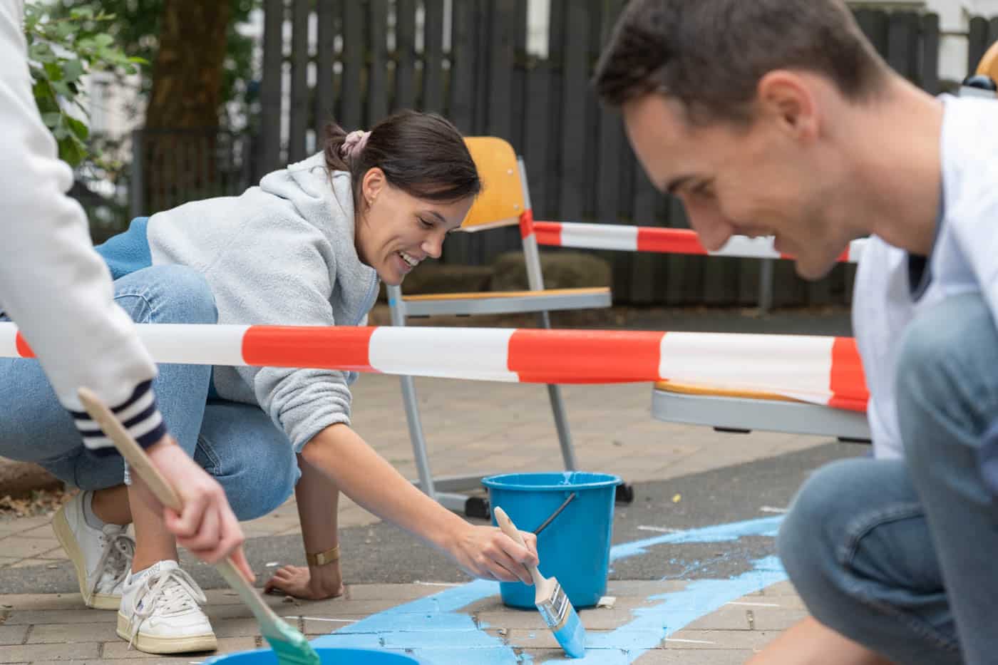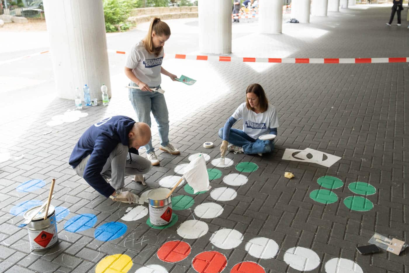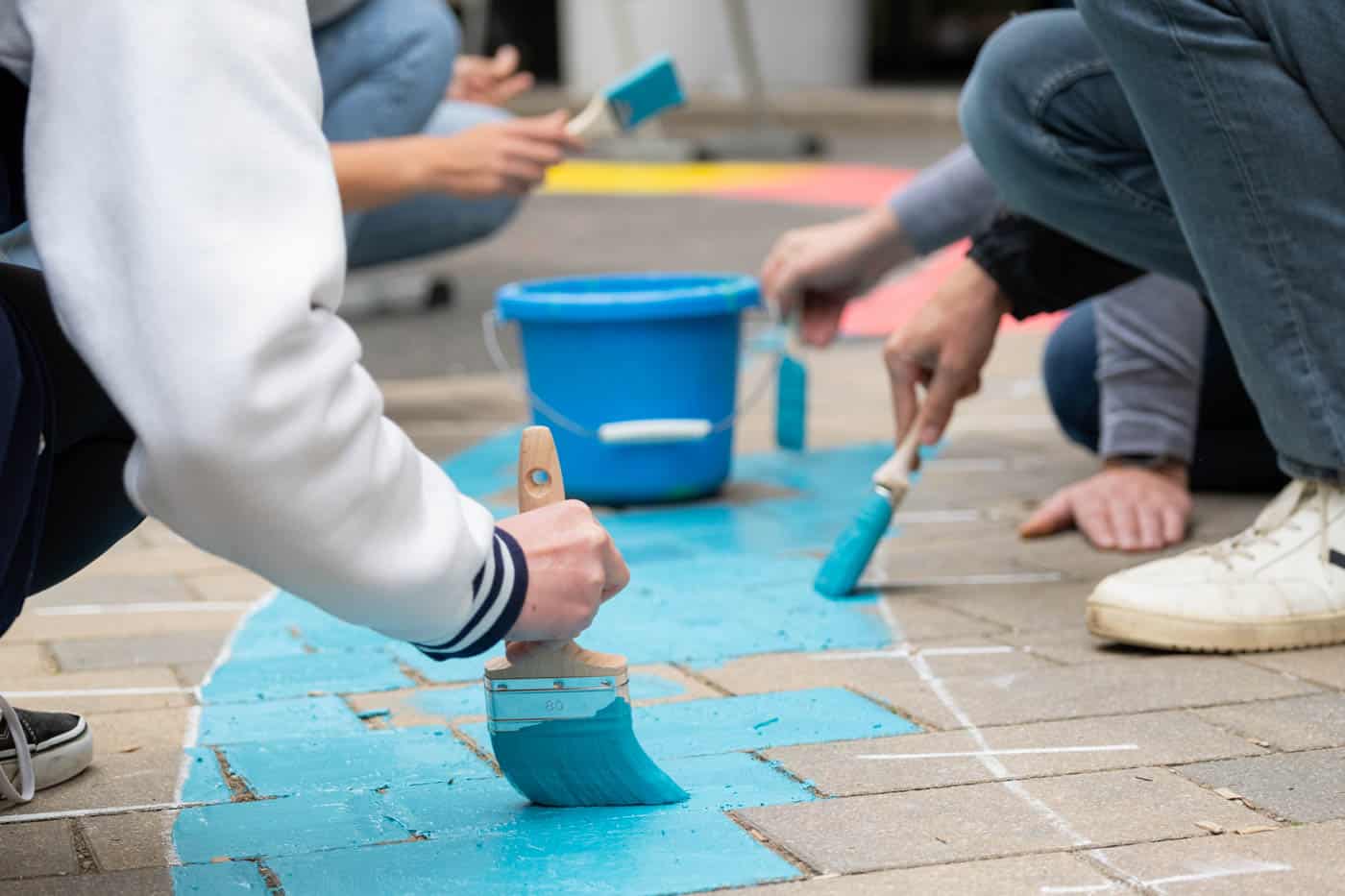 Schulgebäude & Schulhofgestaltung standen in der Grundschule an. Und da war Einiges zu streichen und neu zu bemalen – von den Affirmationssprüchen auf den Treppenstufen bis hin zu Spielfeldern auf dem Schulhof. »Mensch ärger dich nicht!«, Buchstabenschlange oder Hunderterfeld sollten wieder frisch und bunt leuchten. Ein engagiertes Team der R+V Versicherung nahm die Herausforderung an zwei aufeinanderfolgenden Tagen an.
