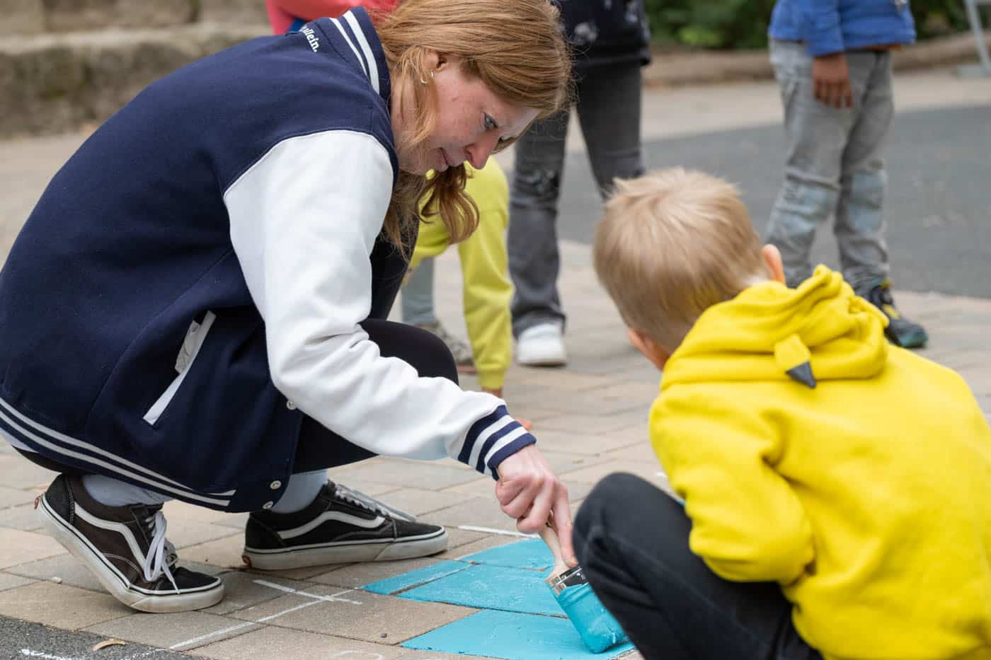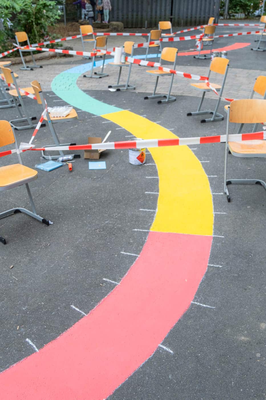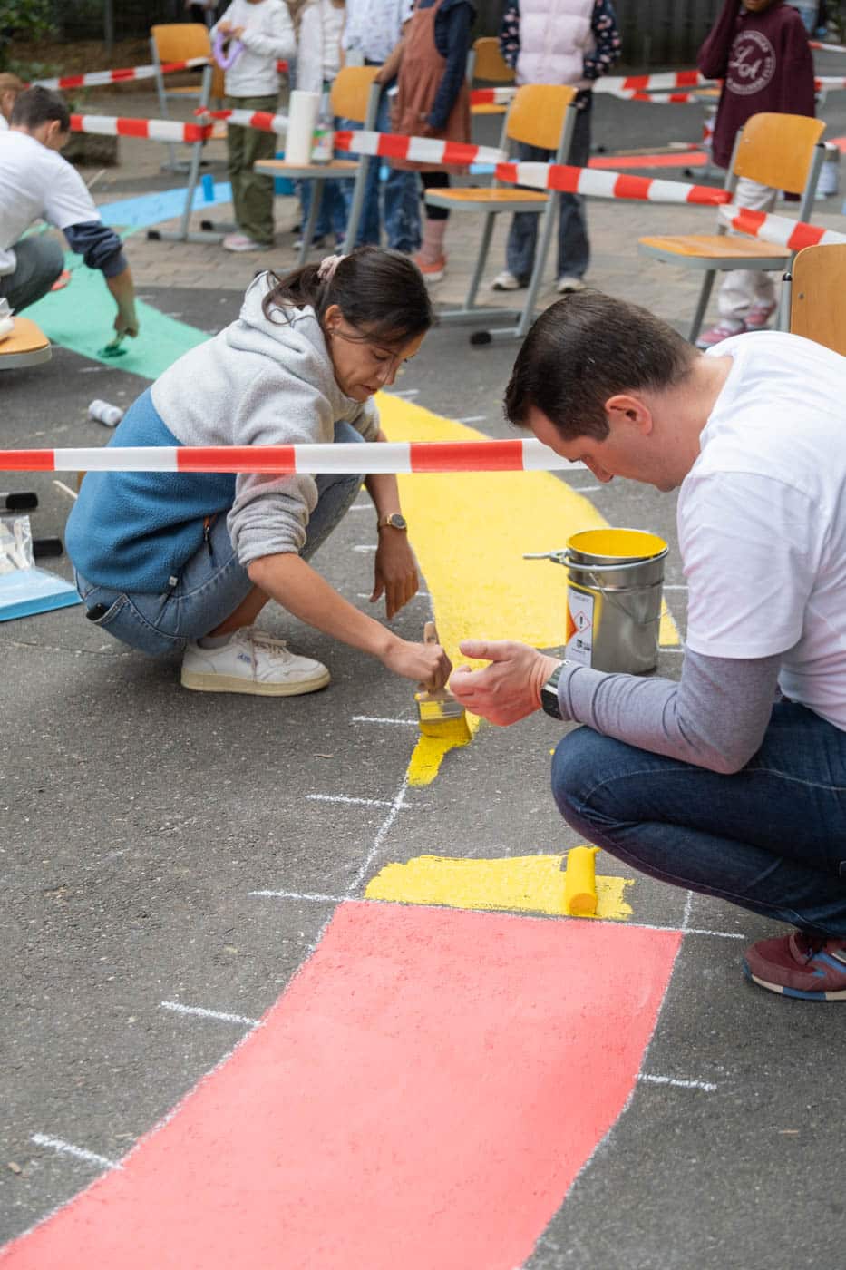 Schulgebäude & Schulhofgestaltung standen in der Grundschule an. Und da war Einiges zu streichen und neu zu bemalen – von den Affirmationssprüchen auf den Treppenstufen bis hin zu Spielfeldern auf dem Schulhof. »Mensch ärger dich nicht!«, Buchstabenschlange oder Hunderterfeld sollten wieder frisch und bunt leuchten. Ein engagiertes Team der R+V Versicherung nahm die Herausforderung an zwei aufeinanderfolgenden Tagen an.