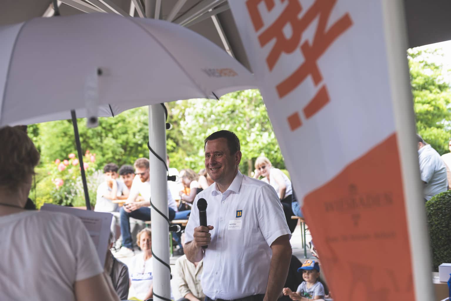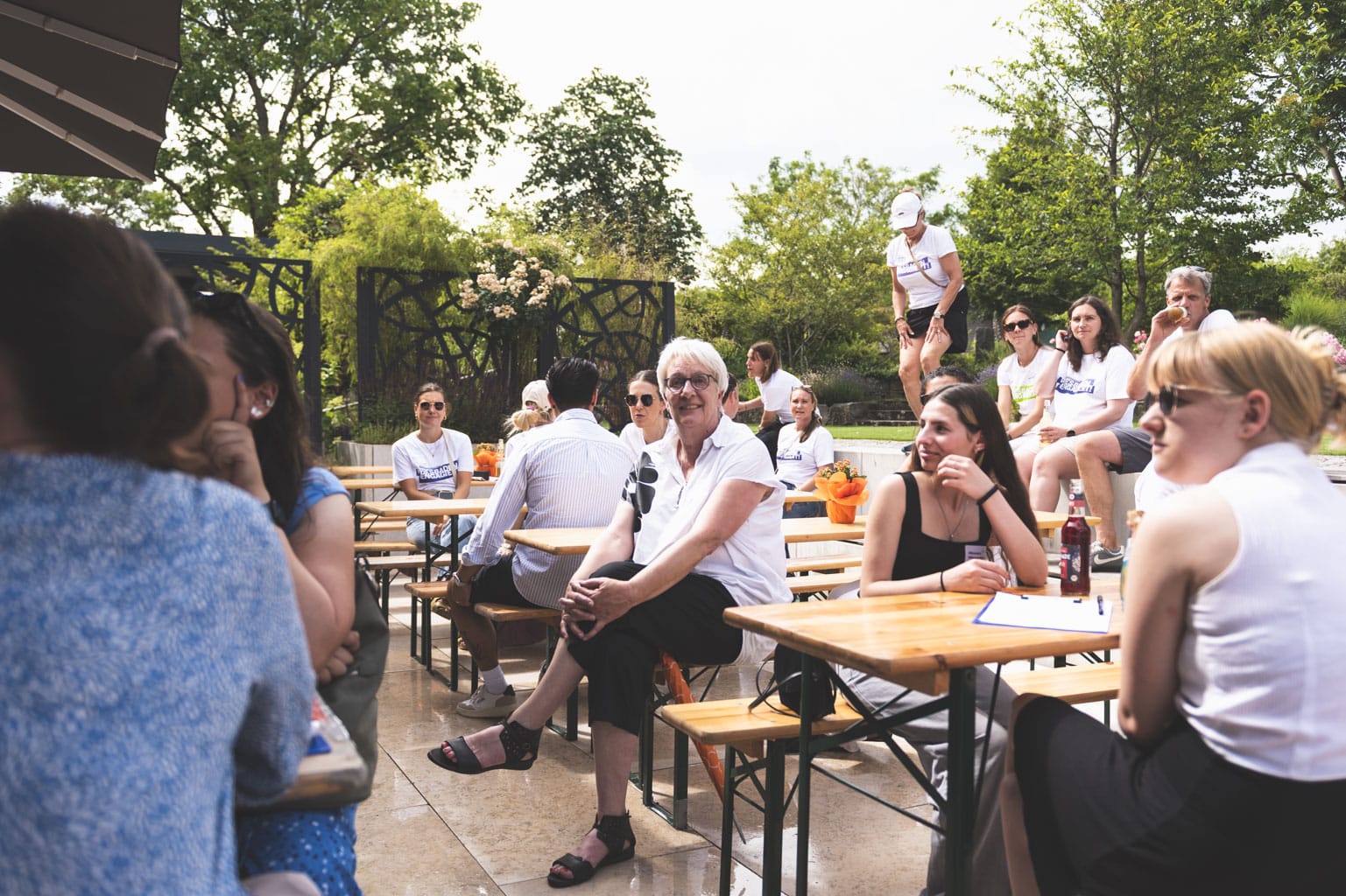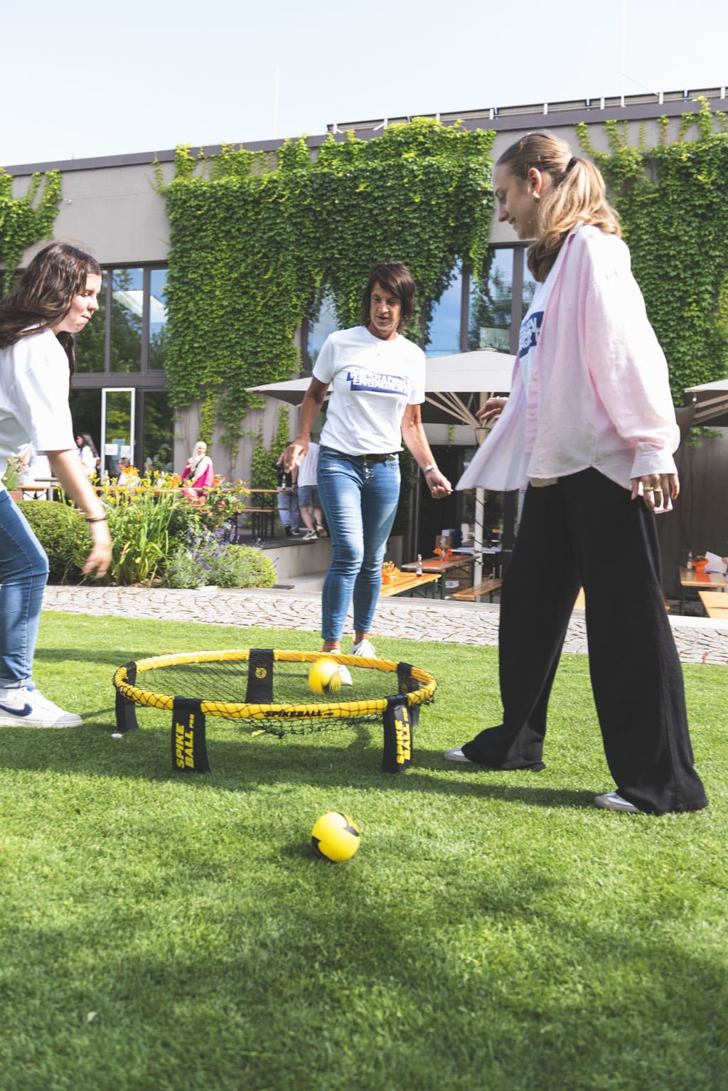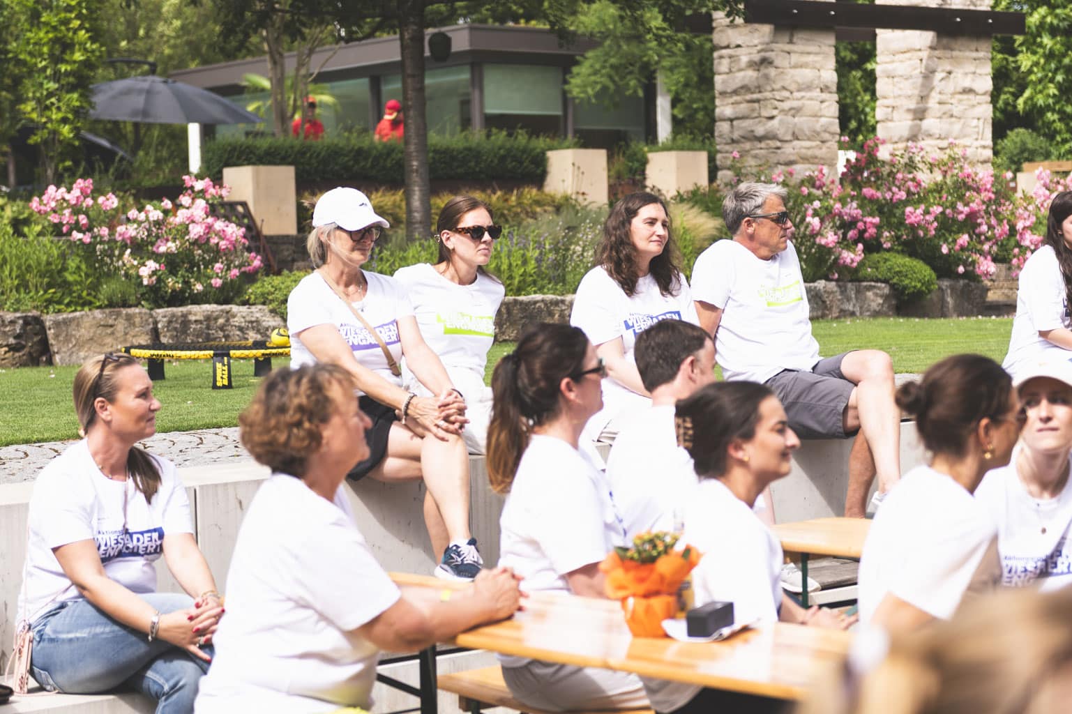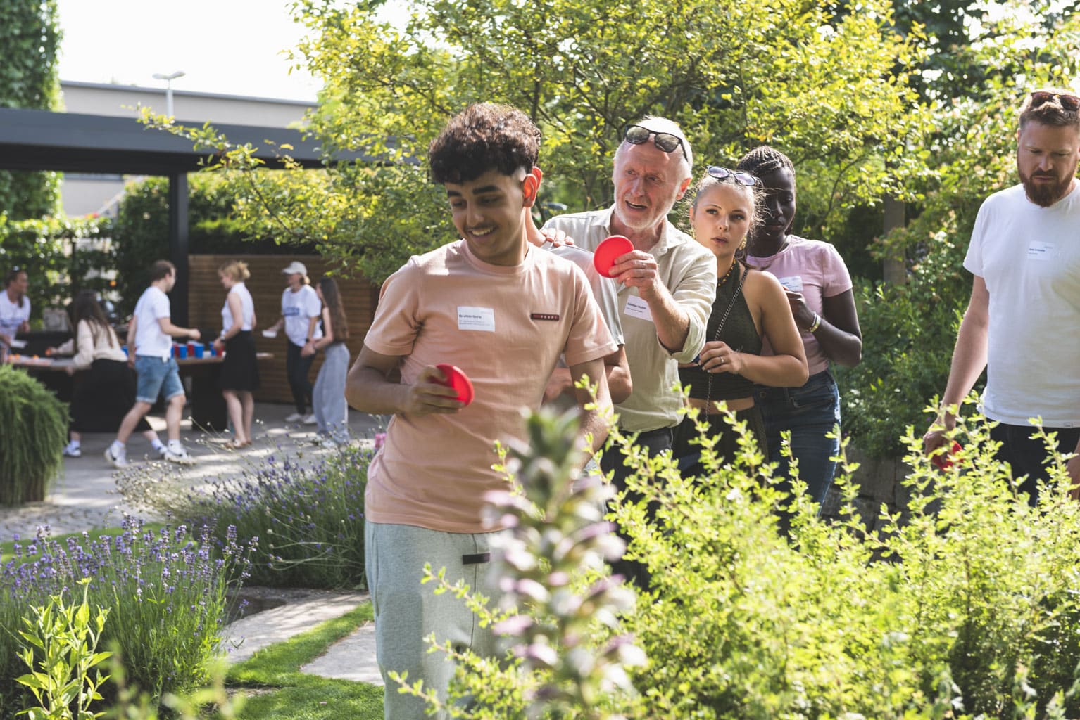 Fast 100 Jugendliche aus allen WiesPaten-Gruppen feierten mit ihren studentischen Lehrkräften und ihren Patinnen und Paten aus 20 Unternehmen ein gemeinsames Sommerfest. Es fand zum wiederholten Male im wunderschönen Ideengarten der Firma Gramenz in Erbenheim statt. Im Mittelpunkt des Fests stand der sogenannte »WiesPaten Wettstreit«, bei dem sich die einzelnen Patenschaften an 10 Spielstationen miteinander maßen. Die engagierten Mitarbeitenden von der R+V Versicherung AG und ctc events halfen bei Auf- und Abbau und sorgten während des Festes für die Betreuung der 10 Spielstationen. Das »Spiel ohne Grenzen« brachte alle in Bewegung und stärkte den Teamgeist.